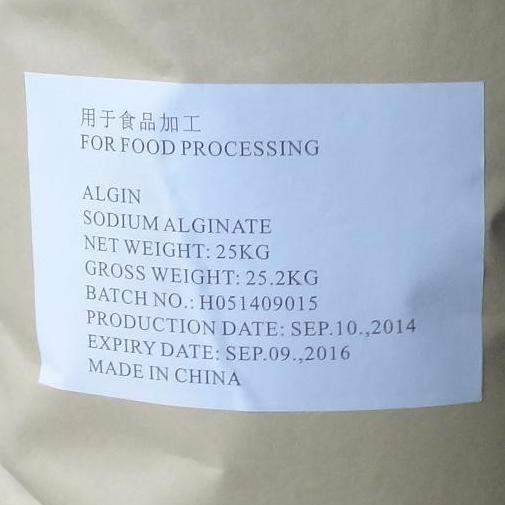 D: Gelling property: Sodium Alginate suits to make kinds of gel product, which can be kept the fine state, nonleakage and contraction. So it also fits iced products and man-made products. Using this specific property, it can be used as a cover for fruit, meat and seaweed products away from air and keep it stored longer. In addition, it also can be used as the sugar coating of bread, the cover of filling and cake and the auto-coagulant of canned food, which will not change in high/low temperature and acid conditions. It also can replace carrageenan to make a crystal soft sugar, elastic, unsticky, transparent.